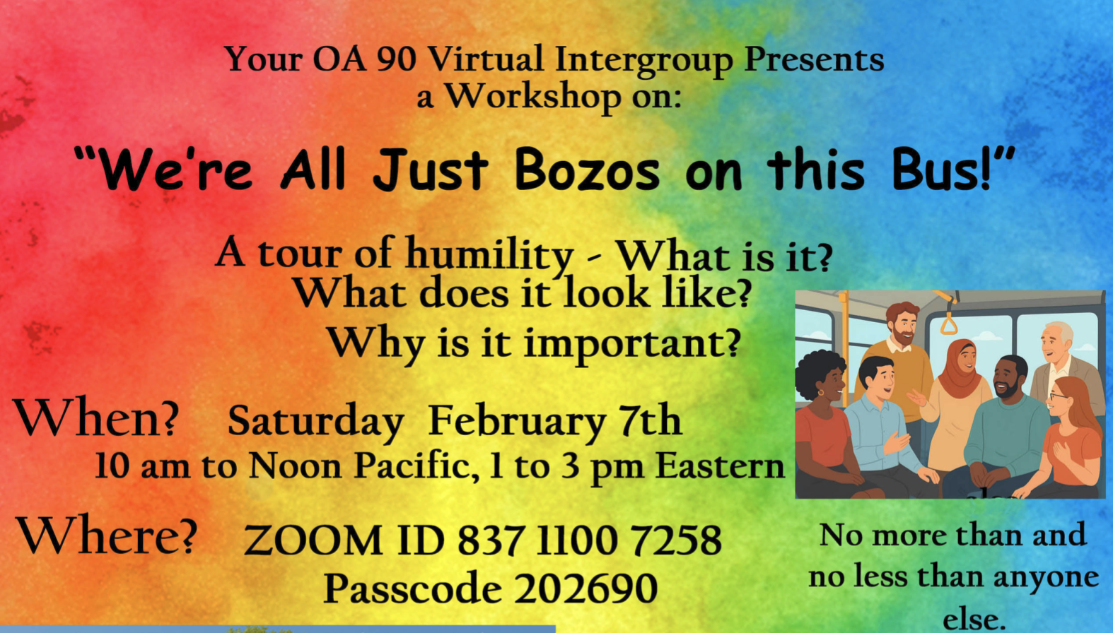 A Tour of Humility. Join us February 7, 1-3 PM EST, on Zoom for this workshop. Why humility? We need to be right-sized in all respects, not just physically. Hear speakers with long-term abstinence discuss this question. We’re all just bozos on the bus! For more information, click here.